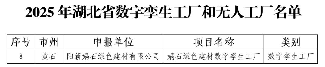 近日,湖北省经济和信息化厅办公室正式公布2025年湖北省数字孪生工厂和无人工厂名单,我县阳新娲石绿色建材有限公司脱颖而出,成功跻身数字孪生工厂行列,为阳新县制造业智能化升级注入强劲动力!