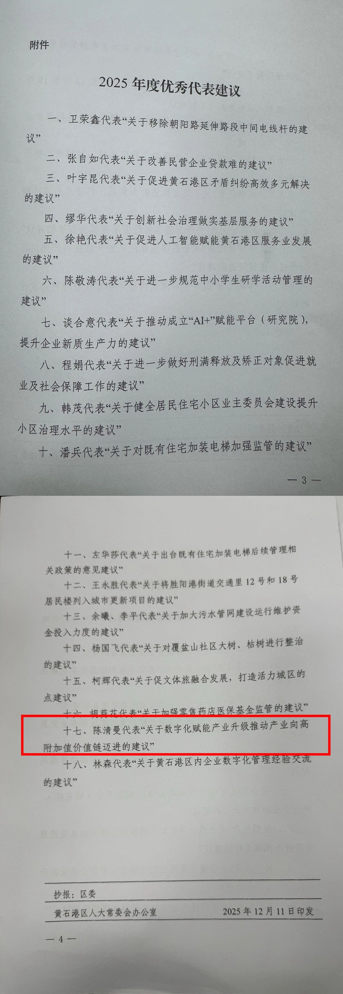 12月26日上午黄石港区“两会”开幕,冯雨区长作政府工作报告,报告中重点提到,企点创成功创建全省唯一一家工业互联网专业型研究所!企点创公司陈清曼提出的“关于数字化赋能产业升级推动产业向高附加值价值链迈进的建议”获评为2025年度优秀代表建议。