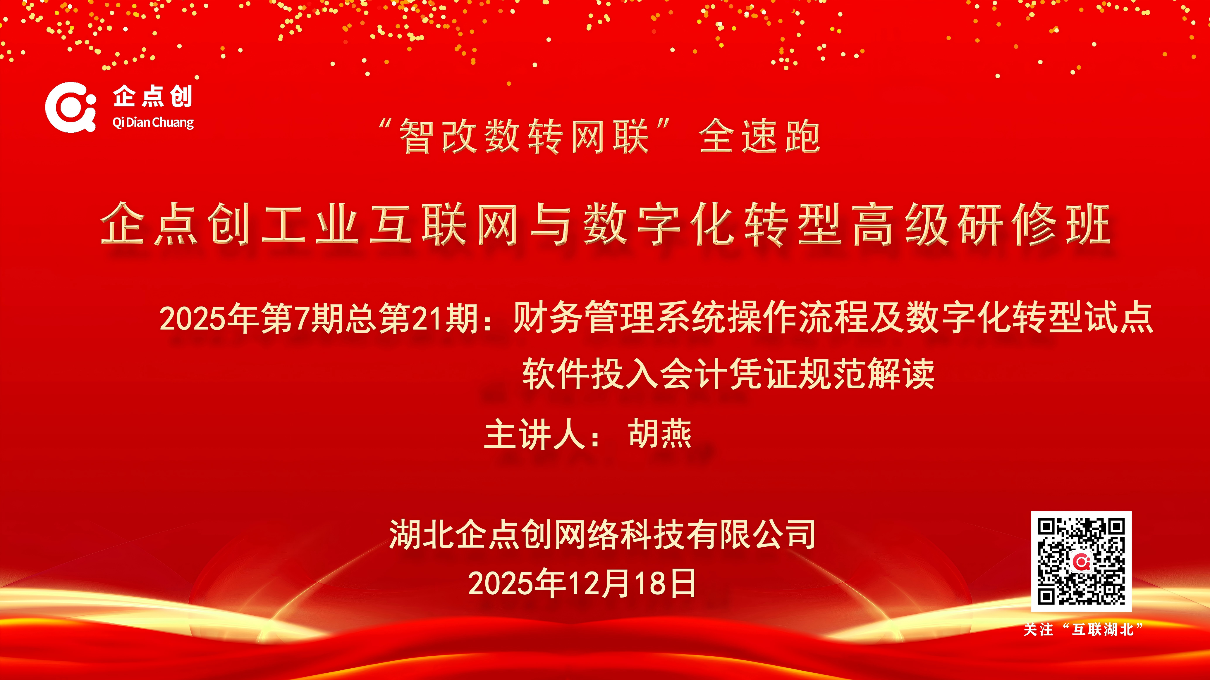 12月18日下午,企点创公司工业互联网与数字化转型高级研修班2025年第7期总第21期正式开讲。本期聚焦“财务管理系统操作流程及数字化转型试点软件投入会计凭证规范解读”专题,由胡燕担任主讲人,普及日常工作中的财务知识,深度解读财务管理系统操作流程与试点验收中审计资料核查规范。