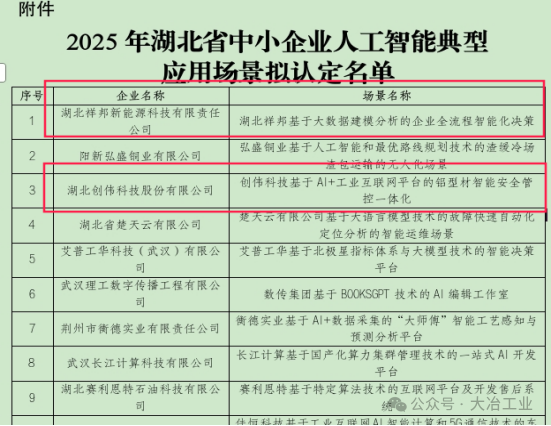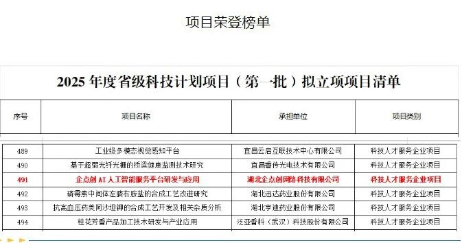 NO.6 2025年赋能建材铝型材、装备制造、电子信息、轻工包装等产业链重点企业争创试点示范,成功打造一大批数字化转型标杆企点创通过数字化转型成效服务一批企业争创国家、省市试点示范荣誉。如2025年服务世星、华盛、祥邦、拓盈等4家企业获评国家5G工厂名录,服务创伟、华盛、世星、祥邦、拓盈等5家企业获评2025年湖北省5G工厂,服务金桥、网安、尖峰型材、娲石建材等5家获评湖北省无人工厂·数字孪生工厂,服务祥邦、创伟等2家企业通过2025年湖北省中小企业人工智能典型应用场景认定,服务娲石建材、网安科技、尖峰型材、唯美、拓盈等5家企业通过2025年度先进级智能工厂,服务世星药业等1家企业通过2025年湖北省工业互联网平台等,服务美维、娲石建材、上方检测、网安、荆冶湘等5家获评2025年黄石市工业互联网创新发展案例。NO.7 2025年企点创加快人工智能升级应用,迭代研发推出切合中小企业数字化转型的20款“小快轻准”工业软件产品,广泛得到新华网、湖北日报、荆楚网、黄石发布、黄石日报等主流媒体进行先进典型宣传,营造数字化转型等良好氛围,推进工作取得良好成效企点创是以研发为主、聚焦输出中小企业数字化转型解决方案的工业互联网平台服务商,现已形成企点创工业互联网平台系统产品,主要面向建材铝型材、装备制造、电子信息、轻工包装等主导产业工业企业提供AI智能安全管控平台、5G全连接工厂平台、数据采集与监控系统、智慧能源管理系统、设备全生命周期管理系统、ERP系统、OA系统、人工智能以及智能工厂改造整体解决方案等服务,聚焦"五位一体"和"保底套餐"模式赋能中小型工业规上企业“0→1”数字化转型。NO.8 2025年企点创先后获评湖北省制造业数字化促进中心、湖北省云服务供应商、湖北省人工智能典型应用场景、湖北省中小企业人工智能典型应用场景、湖北省工业互联网专业型研究所、湖北省省级科技计划(第一批)立项项目、2024年度黄石市科技创新十佳团队等
