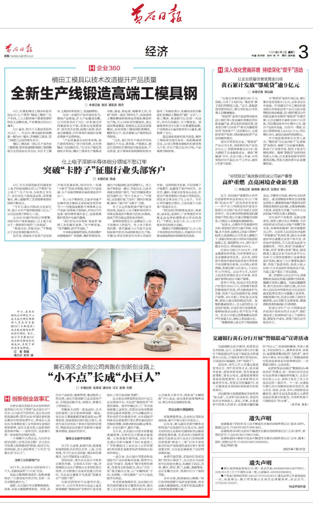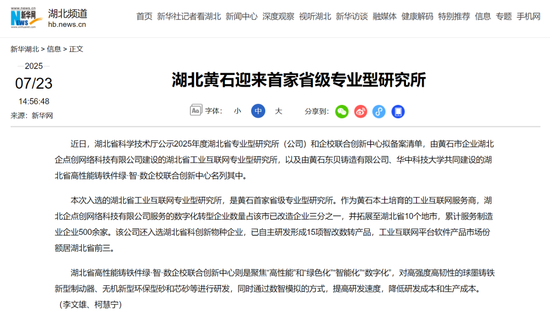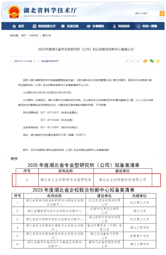 NO.1 2025年企点创积极建言献策,围绕“科技创新与产业创新融合发展”主题交出满意政治答卷12月25日上午,政协黄石市铁山区第九届委员会第五次会议开幕,大会还对优秀政协委员、优秀提案、提案承办先进单位和社情民意优秀信息员予以表扬,企点创公司董事长陈清曼获评优秀政协委员。12月26日上午黄石港区“两会”开幕,区长冯雨作政府工作报告,报告中重点提到,企点创成功创建全省唯一一家工业互联网专业型研究所!企点创公司董事长陈清曼提出的“关于数字化赋能产业升级推动产业向高附加值价值链迈进的建议”获评为2025年度优秀代表建议。NO.2 2025年企点创获评湖北省工业互联网专业型研究所,全省唯一7月18日,经湖北省科技厅评审、现场考察和公示,企点创成功入选2025年度湖北省工业互联网专业型研究所榜单,成为全省本轮入选新型研发机构中唯一一家研究所,也是黄石市第一家省级专业型研究所。企点创坚持科技创新与产业创新融合发展,聚焦深耕工业互联网,聚焦中小企业的“轻量化、低成本”数字化转型需求,凭借自主研发能力,推出“五位一体”模式解决方案,以“专精特新”方式全流程一体化服务广大中小企业数字化转型,不断赋能制造业高质量发展。受到新华网、荆楚网、黄石日报等中央、省市媒体报道等。
