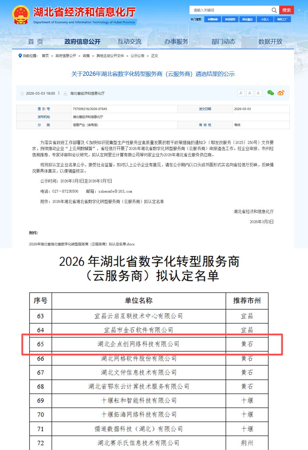 3月3日,经企业申报、市州经信局推荐、专家评审和会议研究,拟认定湖北企点创网络科技有限公司等85家企业为2026年湖北省云服务供应商。企点创2023年-2026年已连续四年成功入选。