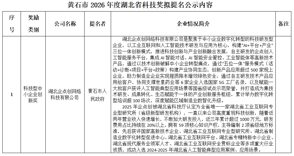 湖北企点创网络科技有限公司拟申报2026年湖北省科技型中小企业创新奖项目的公示